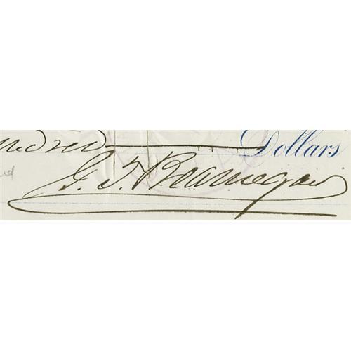 <B>General P. Gustave Toutant Beauregard Document Signed</B></I> "<I>G.T. Beauregard.</B></I>" Signed check, 8.25" x 2.5", Mutual National Bank, New Orleans, Louisiana, August 3, 1880, for the amount of $100. General Beauregard was one of the eight full generals in the Confederate Army and after the defeat of the South he was one of the few high-ranking Confederates to support the rights of freed slaves. The check is in very fine condition; the cancellation stamp slight mars the signature though it is still completely legible; small hole under the letter "n" in bank from stamp; second stamp near the check value. From the Henry E. Luhrs Collection.