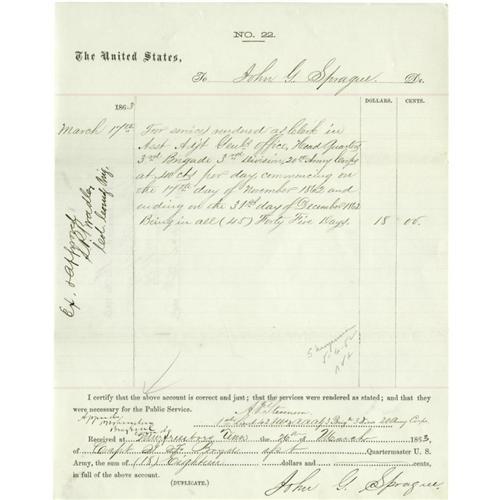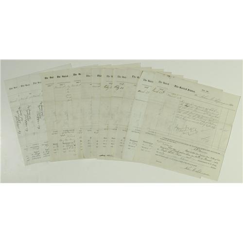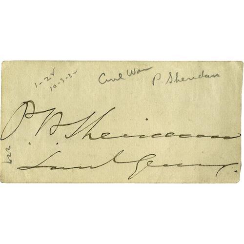 <B>General Philip Sheridan Archive.</B></I> Comprised of 14 Documents Signed, mostly war date, and one Signed Card from the famous General Philip Sheridan. Sheridan distinguished himself as one of the great generals of the Union Army and later as a driving force in the Indian Wars. He is also largely responsible for the preservation and protection of Yellowstone National Park. In this lot there are 14.8" x 10" receipts which are all approved and signed by Sheridan for various Army expenditures. Most of the receipts date from the Civil War. Also included is a 3.7" x 2" signature card which is signed, "<I>P.H. Sheridan.</B></I>" <BR><BR>All 14 Documents are in pristine condition. The Signed Card is Good but slightly soiled. From the Henry E. Luhrs Collection. Accompanied by LOA from PSA/DNA.