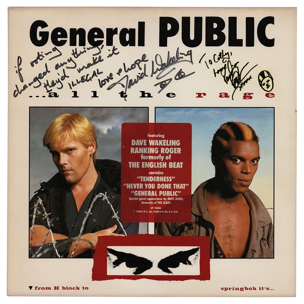 …All the Rage promotional album by General Public, signed and inscribed in black felt tip, "To Cathy, Love, Ranking Roger," who adds a small self-portrait sketch, and "if voting changed anything, they'd make it illegal, love & hope, Dave Wakeling," who draws a pair of eyes. In fine condition, with light yellow haloing to Roger's handwriting. The record is included. Accompanied by a letter of authenticity from Rockaway Records.