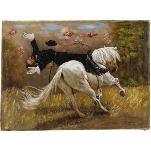 <B>"General Reynolds - Day 1, Gettysburg" - An Oil Painting by Richard Headley.</B></I> This 40" x 30" oil on canvas painting, signed lower right 'R. Headley, 1996' depicts the death of Union General John Fulton Reynolds on July 1, 1863 at the Battle of Gettysburg. An 1841 graduate of the United States Military Academy at West Point, Reynolds fought in the Mexican War and in Indian fighting after which he was commandant of cadets at West Point when the Civil War broke out. He fought at Mechanicsville and Gaine's Mill before being captured at Glendale and later exchanged. <BR><BR>He was in command of I Corps positioning his troops when he fell mortally wounded, purportedly from a sniper's bullet. This vivid oil painting by a living California artist captures the instant that General Reynolds was struck and killed in the field. With cannon shot bursting in the air behind him, he is thrust from his saddle, his white horse startled. The gold colors of his frock coat buttons and general's star and trim at the saddle blanket are in contrast to the blue coat and white horse and serve to make this painting an attractive one, even though it captures the horrors of war. It is nicely framed in a 3/4" wooden frame.<BR><BR><b>Shipping:</b> Framed - without Glass, Large (<a target="_blank" href="http://www.heritageauctions.com/common/shipping.php">view shipping information</a>)