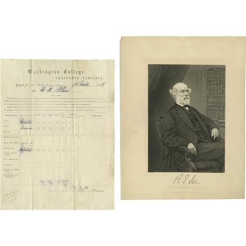 <B>General Robert E. Lee Washington College Document Signed</B></I> "<I>R E Lee</B></I>". One page, 8" x 10.5", partly printed, Lexington, Virginia, June 18, 1868. This is basically a "report card" for a student named G. W. Pilson for the half session, signed by Lee as president of the college. Mr. Pilson took Latin (11th of 22 in class), Greek (13th of 18 in class), and Mathematics (1st of 11 in class). This venerable institution is now known as Washington and Lee University, named after George Washington who provided its first large endowment, and Robert E. Lee who served as president from just after the Civil War until his death in 1870. Very good condition with folds, light soiling, and fold over ink transference affecting the signature a bit. Also included in this lot is a period engraving of Lee and a printed 1907 centenary tribute by Theodore Roosevelt. From the Henry E. Luhrs Collection. Accompanied by LOA from PSA/DNA.