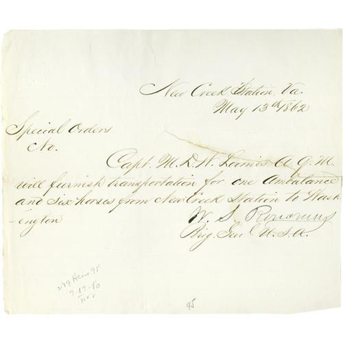 <B>General William S. Rosecrans Autograph Note Signed </B></I> "<I>W.S. Rosecrans Brig. Genl. U.S.A.</B></I>" One page, 7.5" x 6.25", New Creek Station, Virginia, May 13, 1862. The note is a written account of special orders, and reads "<I>No. Capt. M.D.W. Loomis A.Q.M. will furnish transportation for one Ambulance and six horses from New Creek Station to Washington.</B></I>" William S. Rosecrans was a major Union general, although he was relieved of his command after Chickamauga. He went on to become a Congressman from California, and the U.S. Register of Treasury. <BR><BR> The letter is in fine condition; usual folds are present; large tear from the right edge into the center has been repaired but still visible; slight staining on verso. From the Henry E. Luhrs Collection.