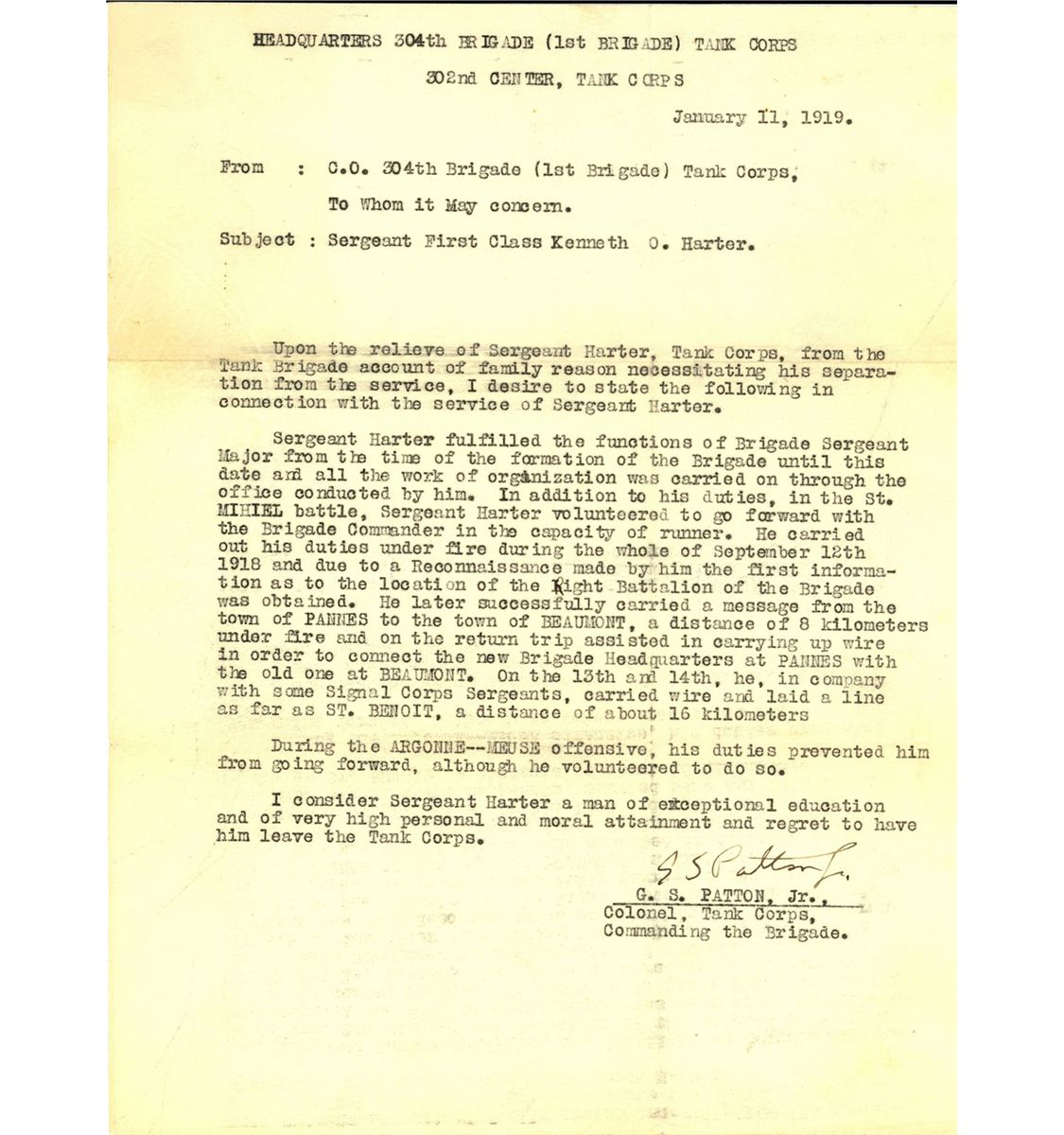 George Patton Typed Letter Signed "G. S. Patton Jr." measures 8" x 10.5". concerning Sergeant Kenneth Harter, highly praised by General Patton. A letter of commendation for Harter of New York dated January 11,1919, on letterhead that reads, "Headquarters 304th Brigade (1st Brigade) Tank Corps" and has as its subject line, "Sergeant First Class Kenneth O. Harter." The letter reports on the invaluable service and character of Sergeant Harter, who was being sent home on "account of family reason necessitating his separation from the service." Toned with light stains. In part: "Sergeant Harter fulfilled the functions of Brigade Sergeant Major from the time of the formation of the Brigade until this date and all the work of organization was carried on through the office conducted by him. .. He carried out his duties under fire during the whole of September.