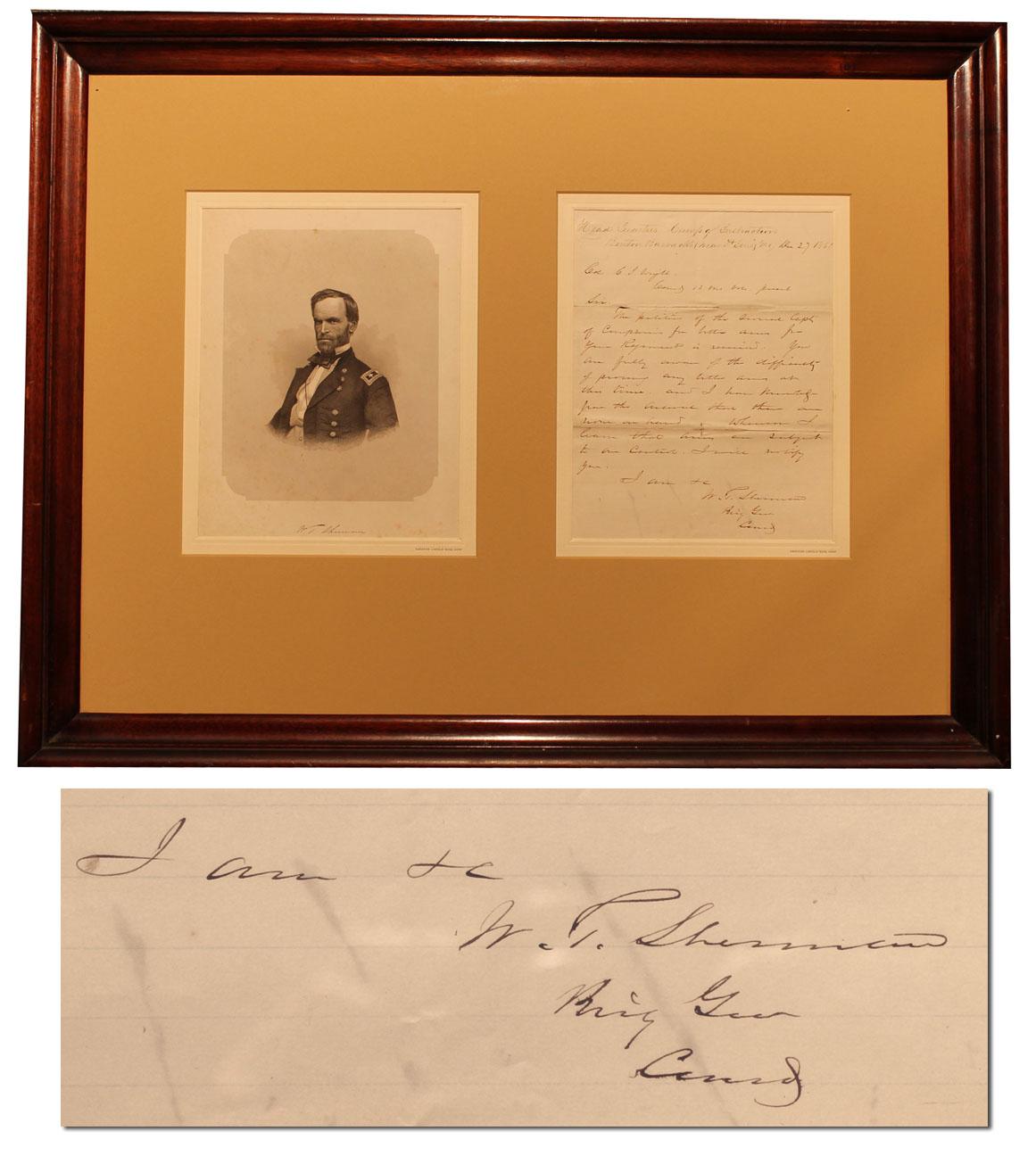 General William Sherman autograph letter signed, dated 27 December 1861 from ''Headquarters / Camp of Instruction / Benton Barracks''. Letter is addressed to Colonel C.J. Wright and discusses the limited amount of firearms. Reads in full: ''Sir, the petition of the several Capts. of Companies for better arms for your Regiment is received. You are fully aware of the difficulty of providing any better arms at this time, and I have knowledge from the Arsenal that there are none on hand. Whenever I learn that arms are subject to our control, I will notice you. I am…W.T. Sherman / Bridg. Gen. Comdg.'' Letter on one page measures 7.5'' x 9.5'', framed to an overall size of 28'' x 22''. In near fine condition with nice signature at close of letter.