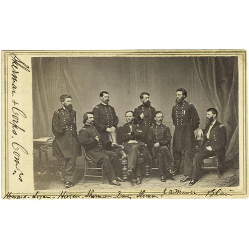 <B>General Sherman and his Generals <I>Carte de Visite</B></I>.</B></I> General Sherman was an accomplished general for the Union during the Civil War, although he did receive some criticism for his actions, such as his "scorched earth" policy and his reported nervous breakdown. This CDV features Sherman seated in the middle of his staff officers. Each one has been identified in ink underneath the image. Pictured are: Oliver Howard, John Logan, William Hazen, Jefferson C. Davis, Henry Slocum, J.A. Mower, and Francis Blair. This photo might have been signed by Mower on the verso, but research of his signature has proved sparse. At any rate, this is a fine exquisite photograph of the man who many called "The First Modern General" and his trusted officers. In very fine condition; crisp and dark emulsion; double lined gilt border; square corners; ink notations on recto and verso; Anthony/Brady imprint; 2-cent proprietary stamp on verso.<BR><BR><b>Shipping:</b> Small Flat (<a target="_blank" href="http://www.heritageauctions.com/common/shipping.php">view shipping information</a>)