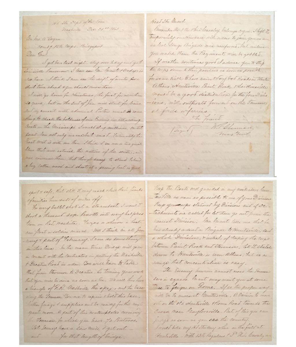 This is a fantastic piece of military history! The Union Army of the West had just won a major victory at Chattanooga. In the letter Sherman is sharing his vision of "drift of events" with General Logan and encouraging him to be ready for what lay ahead. "I have seen Gen. Grant and Dodge is also here" "on the 2nd of Jan will start for Cairo and in concert with admiral Porter must do something to check the boldness of our enemy in attacking boats on the Mississippi." "I think I see one or two quick blows that will astonish the natives of the south and will convince them...that still it may reach & kill their friends & families hundreds of miles off." "will put the Nashville & Decatur Road in order" We will have a triangle of RR, Nashville the apex, and the base along the Tennessee. You are to repair & hold this base. Gather forage & supplies and be ready for the next great move." "Grant may want you at sometime to feign on Rome. If so the proper way will be to cross at Guntersville. A division to move out on the old Huntsville & Rome Road towards the Coosa near Taylorsville." "Remember the 5th Ohio Cavalry belongs to you. I left it temporarily on Hiwassee with orders to join you as soon as Col. Long's Brigade was reinforced." "If weather continues good I advise you to set the corps down to their positions as soon as possible for we are liable to have rain & very bad roads in winter....Athens, Huntsville, Paint Rock, & Larkinsville would be a very good distribution for the divisions." Signed as W. T Sherman, most probably by a secretary. (The Battle of Lookout Mountain was part of the recent Union Victory of Chattanooga. See next two lots.)