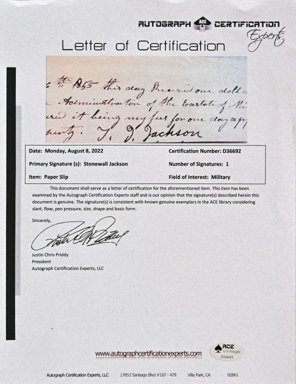 Signature cut measures 2" x 7.5", framed with photo copy of General Jackson. Frame measures 17" x 24"