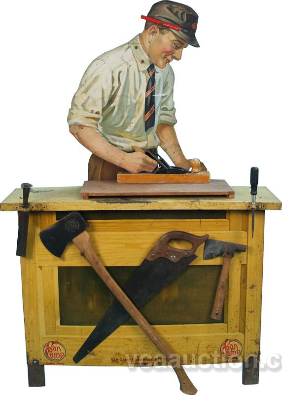 General Store Floor Model Van Camp Hardware & Iron Co. Die-Cut Tin Life-Size Figural Display c1920's can hold actual tools and comes w/ a few tools - 42" x 12" x 60" tall