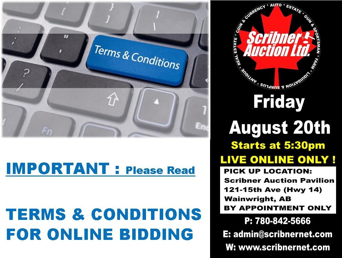 After an item has been sold, that item is the sole responsibility of the purchaser. All merchandise is sold AS IS/WHERE IS. No Guarantees or Warranties Given or Implied. Scribner Auction is not responsible for missing parts. No bidder shall retract his/her bid. All sales are final. Open house Preview on Thursday August 19th from 2pm - 7pm at the Auction location (121 - 15 Ave Wainwright, AB) AND ONLY IF SAFE TO DO SO DURING COVID 19 GOVERNMENT REGULATIONS.