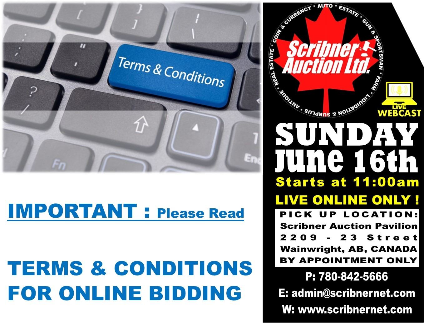FRIDAY & SATURDAY & SUNDAY: Purchases will be packaged up after the auction and shipped via Canada Post or PUROLATOR (for dangerous goods) within 12-16 days of the auction sale. Please contact us via email (scribner.auction@gmail.com) or call 780-842-5666 prior to the auction if you wish to arrange alternate shipping. Shipping & Handling Charges will be charged to your credit card at the time of shipping. Most packages shipped via Canada Post come with $100 insurance. Please review Canada Post Terms & Conditions for Canada Post Insurance Policies. Scribner Auction Ltd. will not be responsible for any damage or breakage to any item for any reason (shipping, handling or otherwise). If you wish to arrange for Pick Up at our Wainwright, AB location, please call our office to make an appointment 780-842-5666. You MUST schedule an appointment (NO DROP INS PLEASE!)