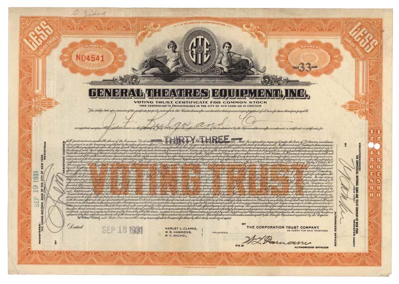 1931, Delaware. Stock certificate for 33 shares. Orange/Black. Engraved vignette of company logo flanked by seated figures. Punch cancelled and fine.