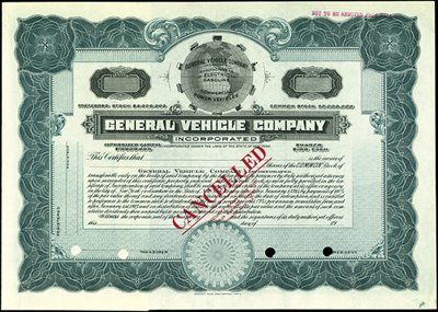 NY. 1913. Odd shs, common stock, green. 10 different very small odd fashioned trucks circling a small globe. "Manufacturers of Electric and Gasoline Commercial Power Vehicles. Rare. First time seen. Specimen Automobile, Auto. SBNC. XF.