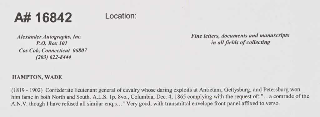 Dated Dec. 4, 1865. With transmittal envelope front panel affixed to verso.