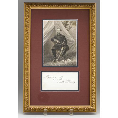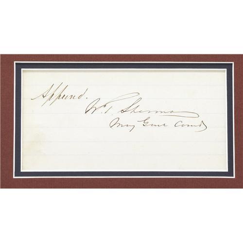 <B>Major General William Tecumseh Sherman War-Date Autograph Endorsement</B></I> with 19th century engraved portrait, no date, on 6.5" x 3.5" lined paper, excised from a document of unknown content, "<I>Approv'd W.T. Sherman Maj. Gen. Comdg</B></I>", double matted and framed under glass in 11" x 17" frame with a 5" x 7.25" engraving of Sherman, in very good condition.<BR><BR><b>Shipping:</b> Framed (<a target="_blank" href="http://www.heritageauctions.com/common/shipping.php">view shipping information</a>)