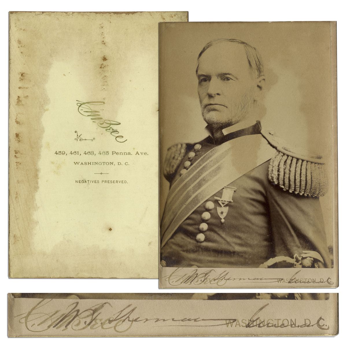 General William T. Sherman cabinet card signed. Photo was taken by famed portrait photographer C.M. Bell. Sherman signs the sepia toned cabinet photo ''W.T. Sherman / General'' to the bottom edge. Bell's address and hallmark are embossed to verso, and also visible underneath Sherman's signature. Measures 4'' x 6''. Toning consistent with a photograph of this age. Very good. With PSA/DNA COA.
