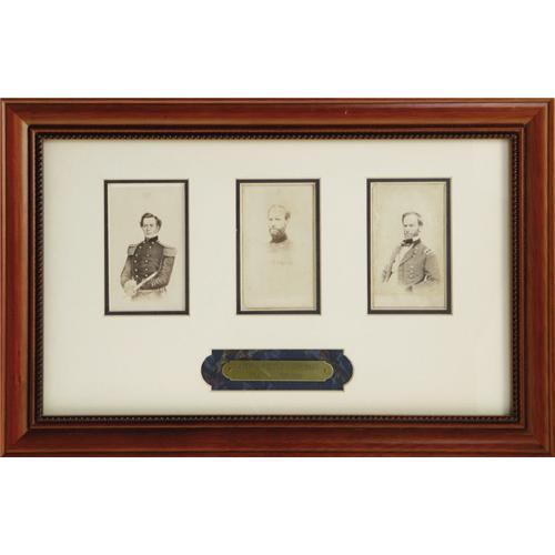 <B>Union General William T. Sherman Framed Group of Three <I>Cartes de Visite</B></I></B></I> <B>Framed Together.</B></I> Each of the three images is matted, with the visible portion of each CDV measuring 2.25" x 3.75". The entire piece is framed to an overall size of 17.25" x 11". A brass nameplate underneath the images reads "GENERAL WILLIAM T. SHERMAN / USA 1820-1891". Two of the images are the work of prolific Civil War photographer Mathew Brady. They are from E & H. T. Anthony from the Brady negatives. All images are in fine condition with some wear present to the image fields but not detracting from the overall appeal. The image on the right displays some minimal foxing not affecting the actual image in the center. This is a handsome display piece for any Civil War CDV collector.<BR><BR><b>Shipping:</b> Framed - with Glass, Medium (<a target="_blank" href="http://www.heritageauctions.com/common/shipping.php">view shipping information</a>)