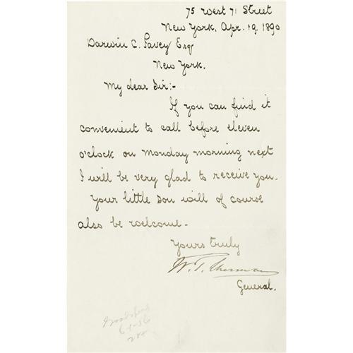 <B>General William Tecumseh Sherman Letter Signed</B></I> "<I>W.T. Sherman, General.</B></I>" One page, 5" x 8", New York, April 19, 1890. The content of the letter is routine. General Sherman was an accomplished general for the Union during the Civil War, although he did receive some criticism for his actions, such as his "scorched earth" policy and his reported nervous breakdown. The letter is in very fine condition; usual folds are present; slight staining on the upper corners. From the Henry E. Luhrs Collection. Accompanied by LOA from PSA/DNA.