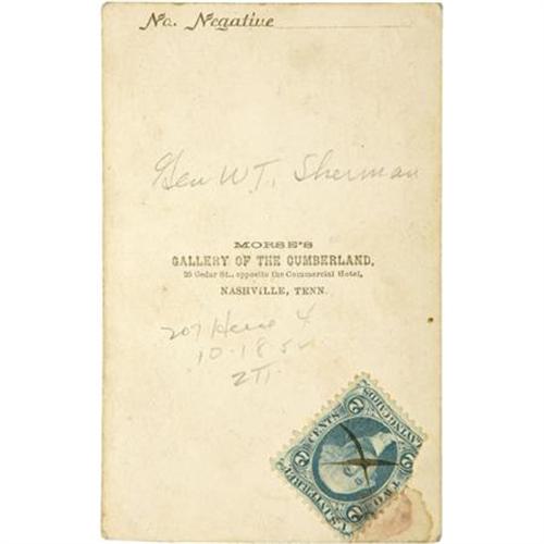 <B>General William Tecumseh Sherman CDV</B></I>. 2.5” x 3.75”, Morse’s Gallery of the Cumberland, Nashville, Tenn. studio mark on verso, .02 cent Internal Revenue stamp affixed to verso, image slightly faded, else very good. <I>Ex. Henry E. Luhrs Collection</B></I>.<BR><BR><BR><b>Shipping:</b> Flat Material, Small (<a target="_blank" href="http://www.heritageauctions.com/common/shipping.php">view shipping information</a>)