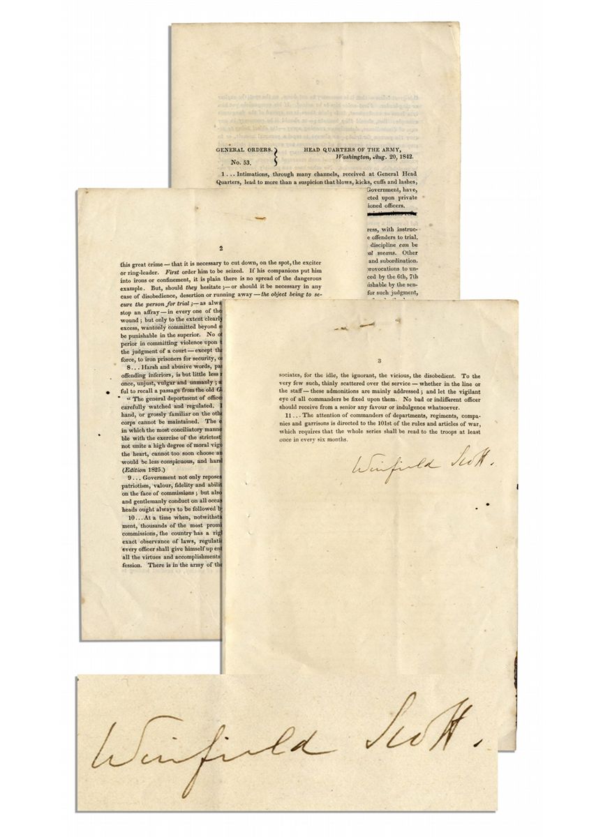 General Winfield Scott signed Army ''General Orders'' related to soldier abuse in the Seminole Wars, published 20 August 1842. Signed ''Winfield Scott'' upon the last page of booklet which reads, ''...[there is] suspicion that blows, kicks, cuffs and lashes...have been inflicted upon private soldiers of the army by their officers...For insolent words, addressed to a superior, let the soldier be ordered into confinement...'' Booklet measuring 4.75'' x 7.5'' is in near fine condition with staple marks, minor staining and one line redacted.