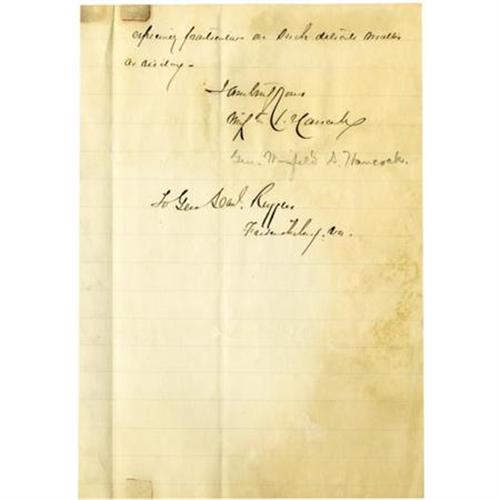<B>General Winfield Scott Hancock Autograph Letter Signed to Former Confederate Daniel Ruggles</B></I> “<I>Winf'd Hancock</B></I>”. Two pages, 5.5” x 8.5”, Washington, D.C., November 17, 1870, in ink, to General Daniel Ruggles. General Winfield Scott Hancock (1824-1886) responds to a former foe, Confederate General Daniel Ruggles, as a result of a misdirected correspondence. The letter reads in part: “<I>I presume the card, which came to my room…was one sent by you to General Morrison, who lived opposite to me in the same hall and which was probably brought to my room by mistake- Any how I should have been glad to have met you: With old friends who have retained my esteem, I am especially particular- on such delicate matters as visiting…</B></I>”. Hancock was a career army officer who served with distinction in the Mexican War and was especially known for his personal leadership during the Battle of Gettysburg. Ruggles commanded a division during the Battle of Shiloh. The paper exhibits some uneven toning and there are some mounting remnants on the verso of the integral sheet, else good condition. <I>From the collection of Henry E. Luhrs.</B></I><BR><BR><b>Shipping:</b> Flat Material, Small (<a target="_blank" href="http://www.heritageauctions.com/common/shipping.php">view shipping information</a>)