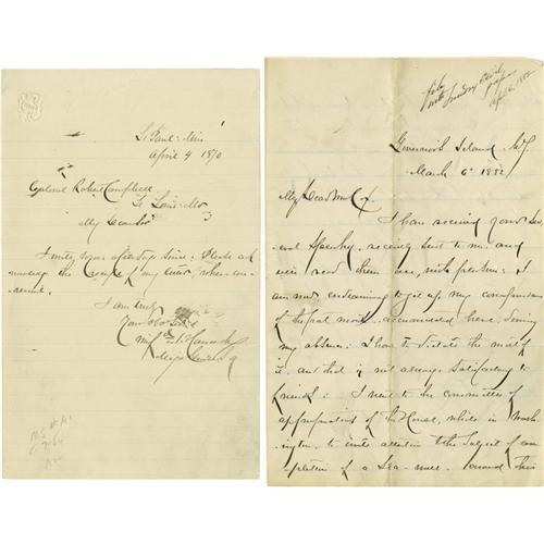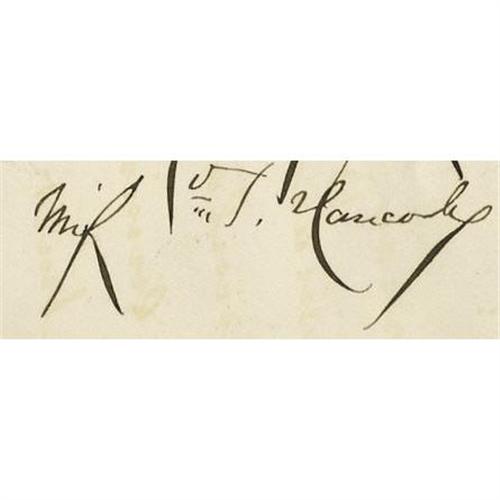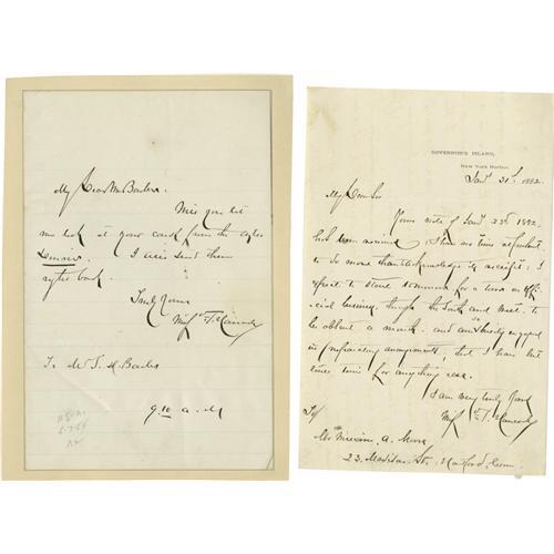 <B>General Winfield Scott Hancock- Five Autograph Letters Signed</B></I> "<I>Winfd Scott</B></I>". An amazing collection of five letters written and signed by this legendary Civil War general and presidential candidate of whom Ulysses S. Grant once said, "Hancock stands the most conspicuous figure of all the general officers who did not exercise a separate command. He commanded a corps longer than any other one, and his name was never mentioned as having committed in battle a blunder for which he was responsible." <BR><BR>Letter one: four pages, 5" x 8", Governor's Island letterhead, January 15, 1881, to Congressman S. S. Cox (of Ohio). Asking for assistance in getting a sea-wall built around the island, in part: "<I>Governor's Island lies in the 'jaws' of the two rivers- and the object of the Sea-Wall is sanitary...The filth from the two rivers is precipitated upon this island, now. With a Sea-wall, it would pass by instead of gathering upon the rocks...</B></I>" Fine condition with mailing folds. <BR><BR>Letter two: four pages, 5.5" x 8.25", Governor's Island, March 6, 1882, also to Congressman Cox. Another letter regarding the Sea-wall project. Very good condition with mailing folds and light soiling. <BR><BR>Letter three: one page, 5" x 8", St. Paul, April 4, 1870, to Colonel Robert Campbell. Asks for confirmation of receipt of recent letter. Very good condition with folds and some ink smearing. <BR><BR>Letter four: one page, 5.5" x 8.25", np, nd (9:10 a.m.), to Mr. Bader. In full: "<I>Will you let me look at your cards from the Aztec Dinner. I will send them right back.</B></I>" Fine condition with folds, mounted by integral blank leaf to larger sheet. <BR><BR>Letter five: one page, 5.5" x 8.5", Governor's Island letterhead, January 31, 1882, to William A. Moore. An acknowledgement of receipt of a note. Fine condition with light folds and mounting traces on verso of blank integral leaf. From the Henry E. Luhrs Collection. Accompanied by LOA from PSA/DNA.