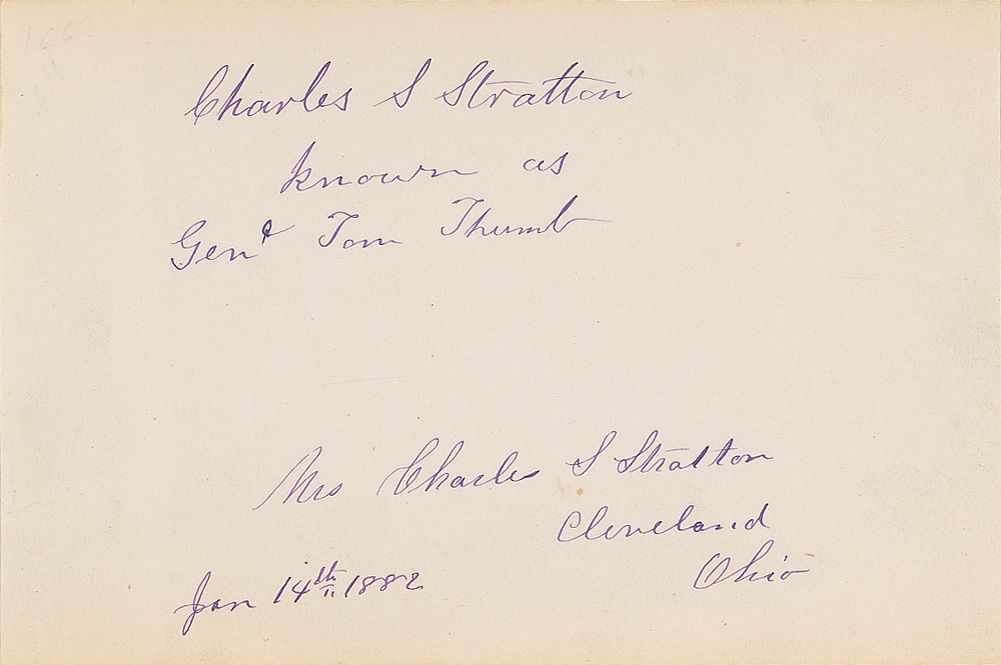 American little person and entertainer (1838–1883), born Charles Sherwood Stratton, who became one of the most popular and legendary ‘attractions’ managed by legendary showman P. T. Barnum. Ink signature, “Charles S. Stratton known as Genl Tom Thumb,” and “Mrs. Charles S. Stratton, Cleveland, Ohio, Jan 14th 1882,” on an off-white 6 x 4 album page. In fine condition, with some slight edge toning.