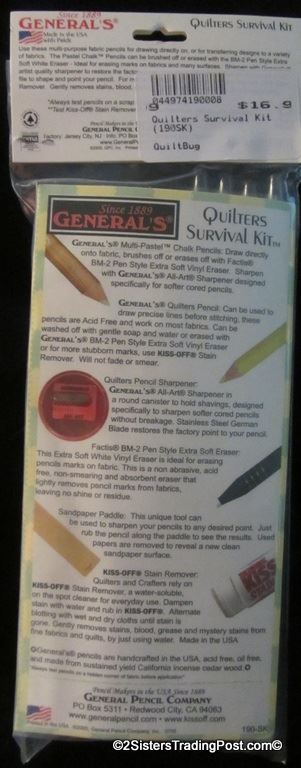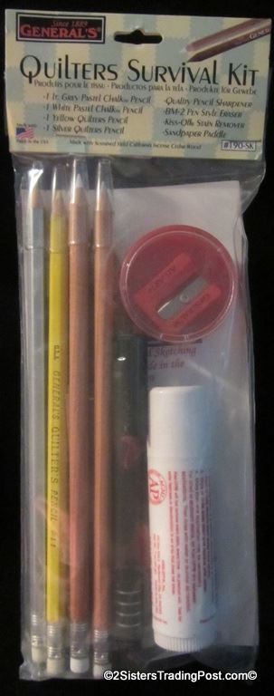 Kit #190-sk includes 1 each of the following: light grey pastel chalk pencil, white pastel chalk pencil, yellow quilters pencil, silver quilters pencil, pencil sharpener, BM-2 pen style eraser, Kiss-Off stain remover stick & a sandpaper paddle SRP $16.95