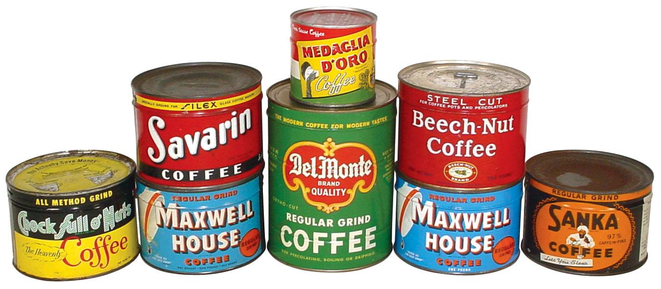 General store shelf stock, coffee tins (8), all unopened, 2# Del Monte, 4 oz Medaglia D'Oro & 6 one # cans, all in Exc cond w/orig contents.