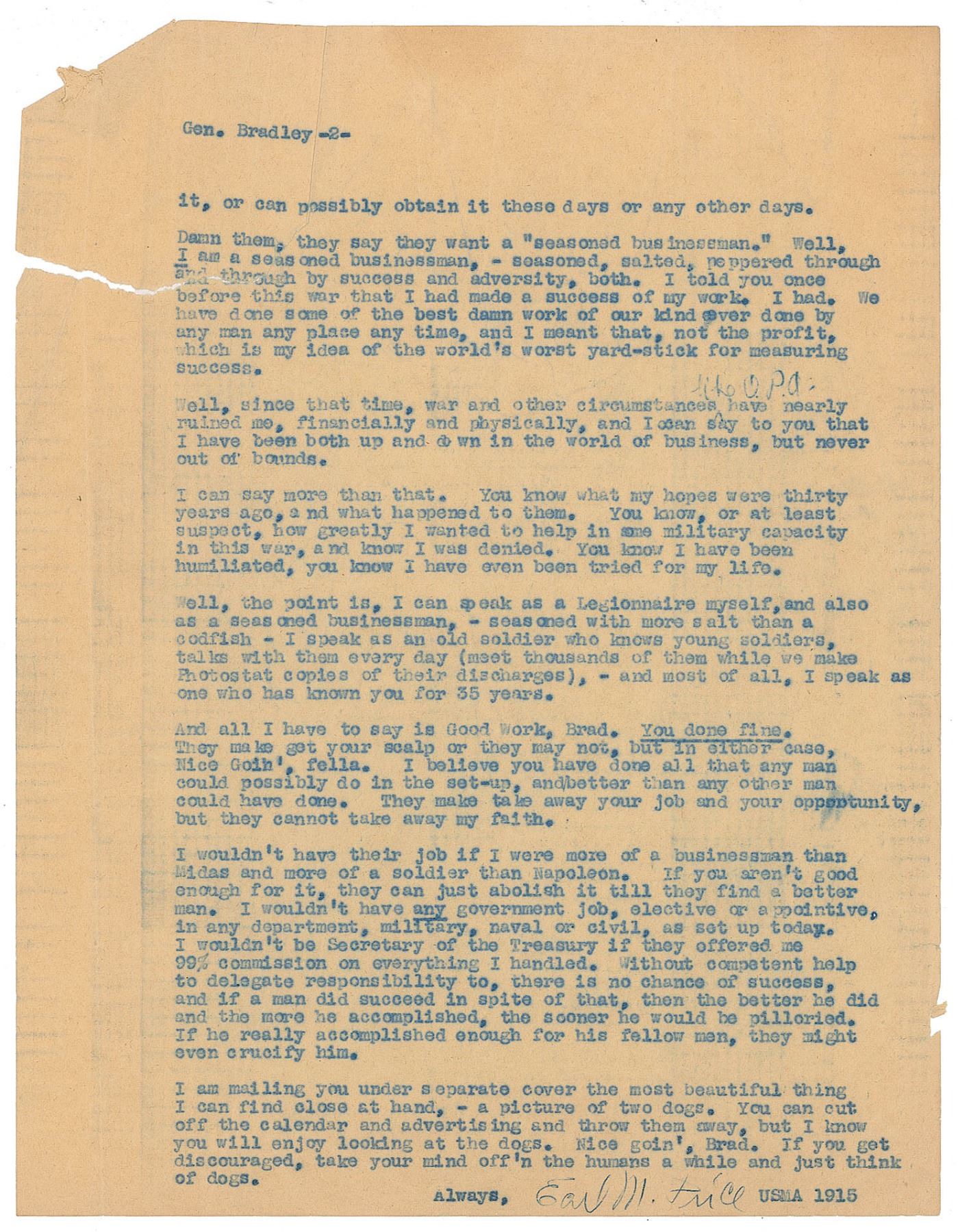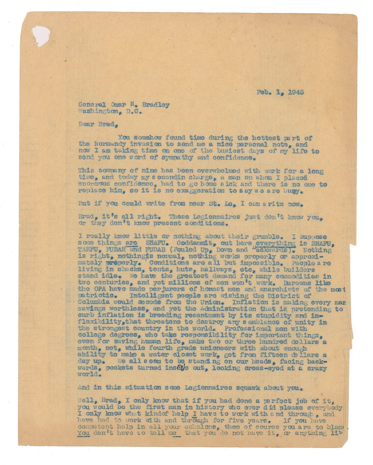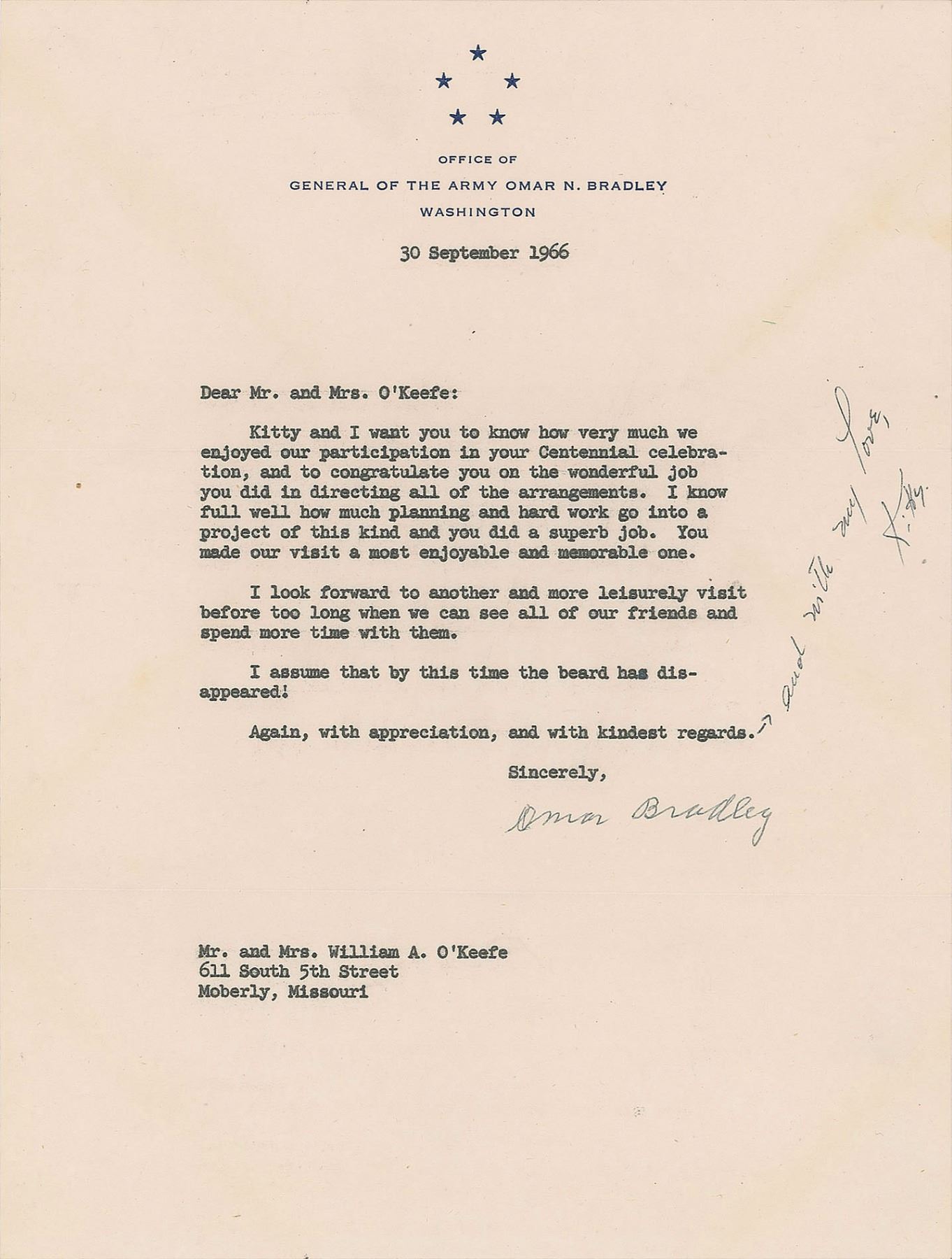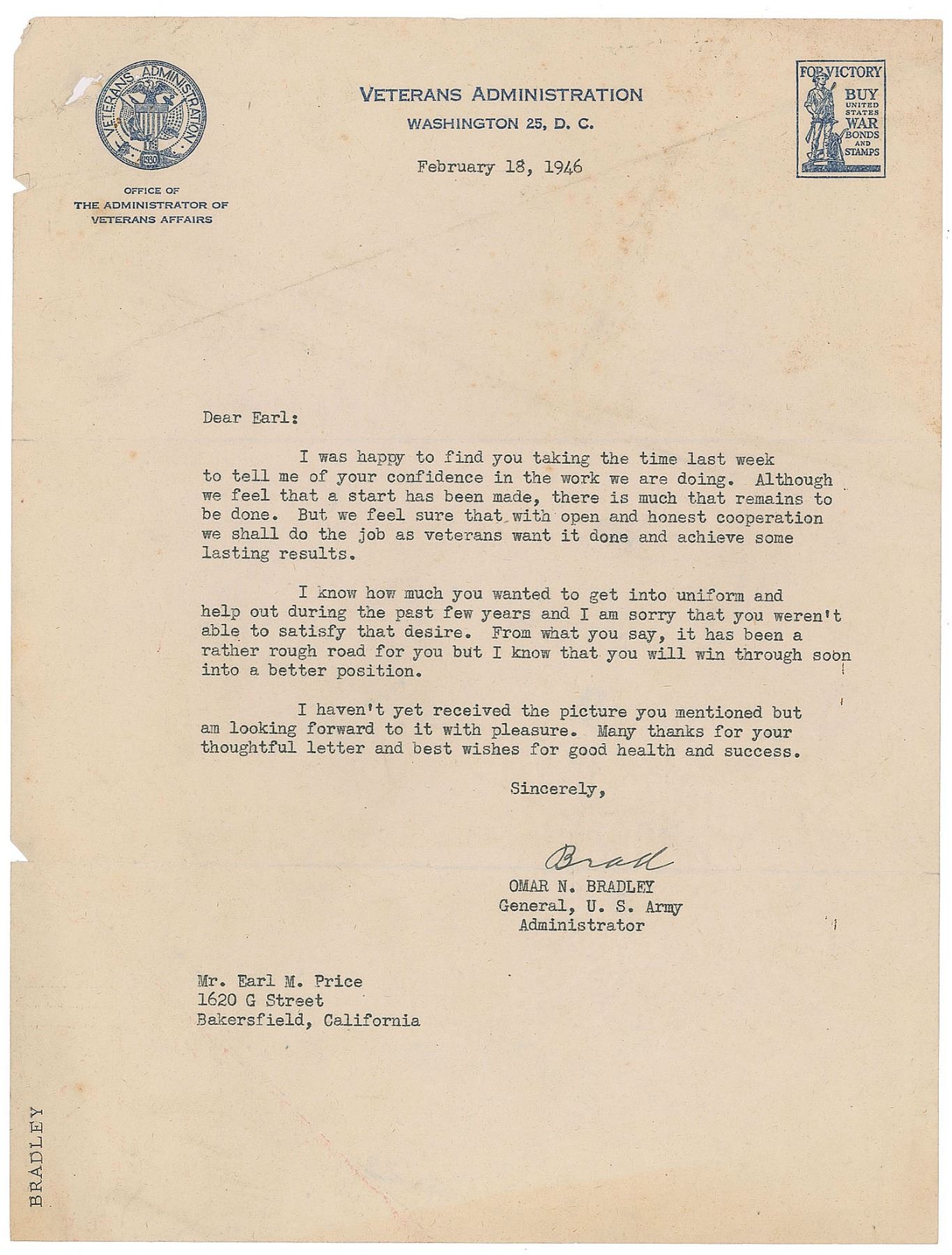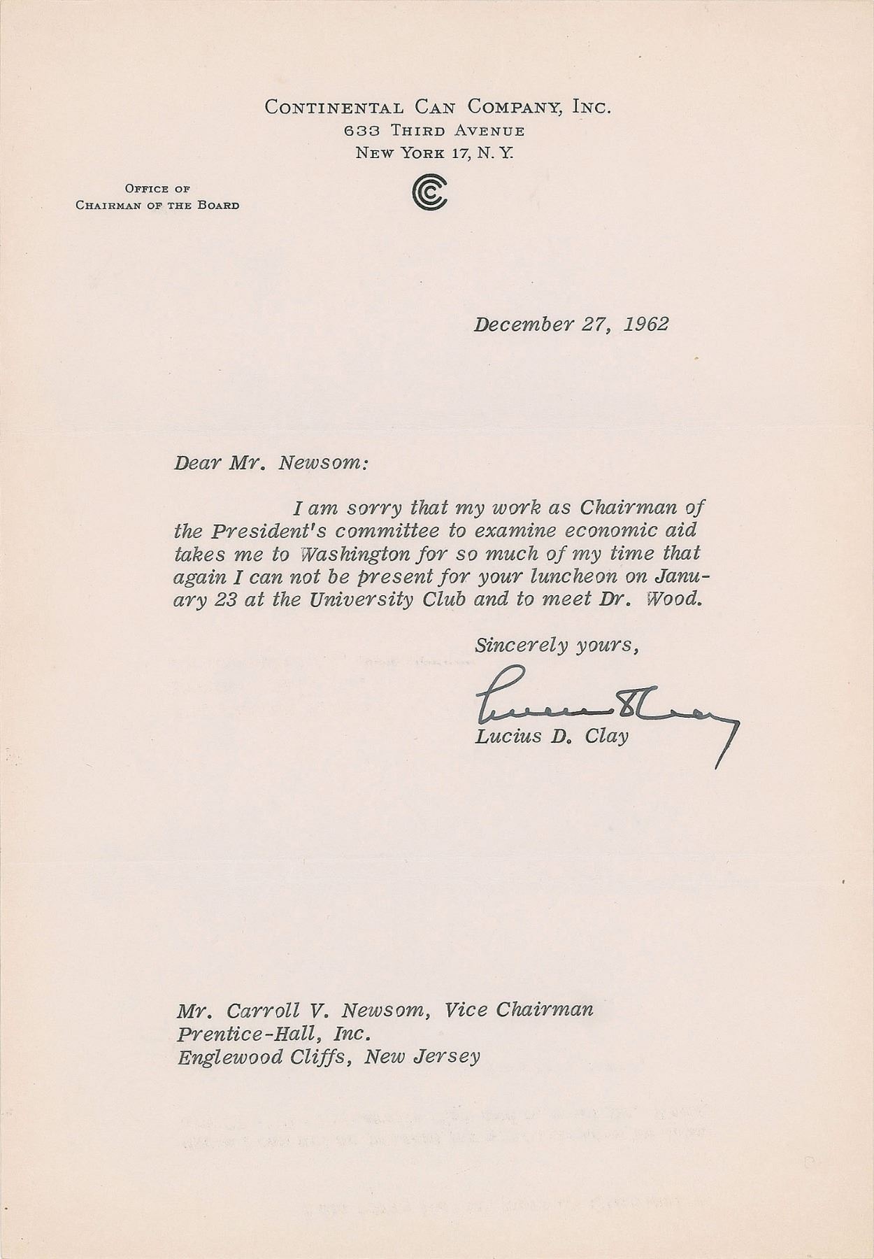 Group of six TLSs by noted American WWII generals, including: Omar Bradley (2), Mark W. Clark, Lucius D. Clay, Barney M. Giles, and Jonathan M. Wainwright. Highlights include: one of Bradley's letters, dated 1946, replying to a letter from a supporter, in part, "I know how much you wanted to get into uniform and help out during the past few years"; and Giles's letter, dated June 30, 1945, in part, "It is our hope that our planes will so thoroughly demolish Japanese cities and industry that the final assault on the Jap homeland may be accomplished in record time and with record results." In overall very good to fine condition, with file holes to the Clark letter.