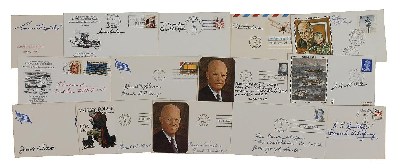 Fourteen commemorative covers and FDCs, each signed by a different United States World War II General. Signers are: Lauris Norstad, T. H. Landon, Ira Eaker, Maxwell Taylor, Mark Clark, Paul Fontana, Harold K. Johnson, R. W. Grow, James Van Fleet, Joseph Smith, Lyman Lemnitzer, Elwood Quesada, William H. Simpson, and J. Lawton Collins. In very fine condition.