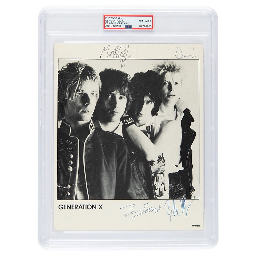 Vintage cardstock 8 x 10 promo photo of Generation X, signed in blue ballpoint by Billy Idol, Tony James, Mark Laff, and Derwood Andrews. In very good to fine condition, with scattered light creasing, and two small tack holes. Encapsulated and graded by PSA/DNA as "NM-MT 8."