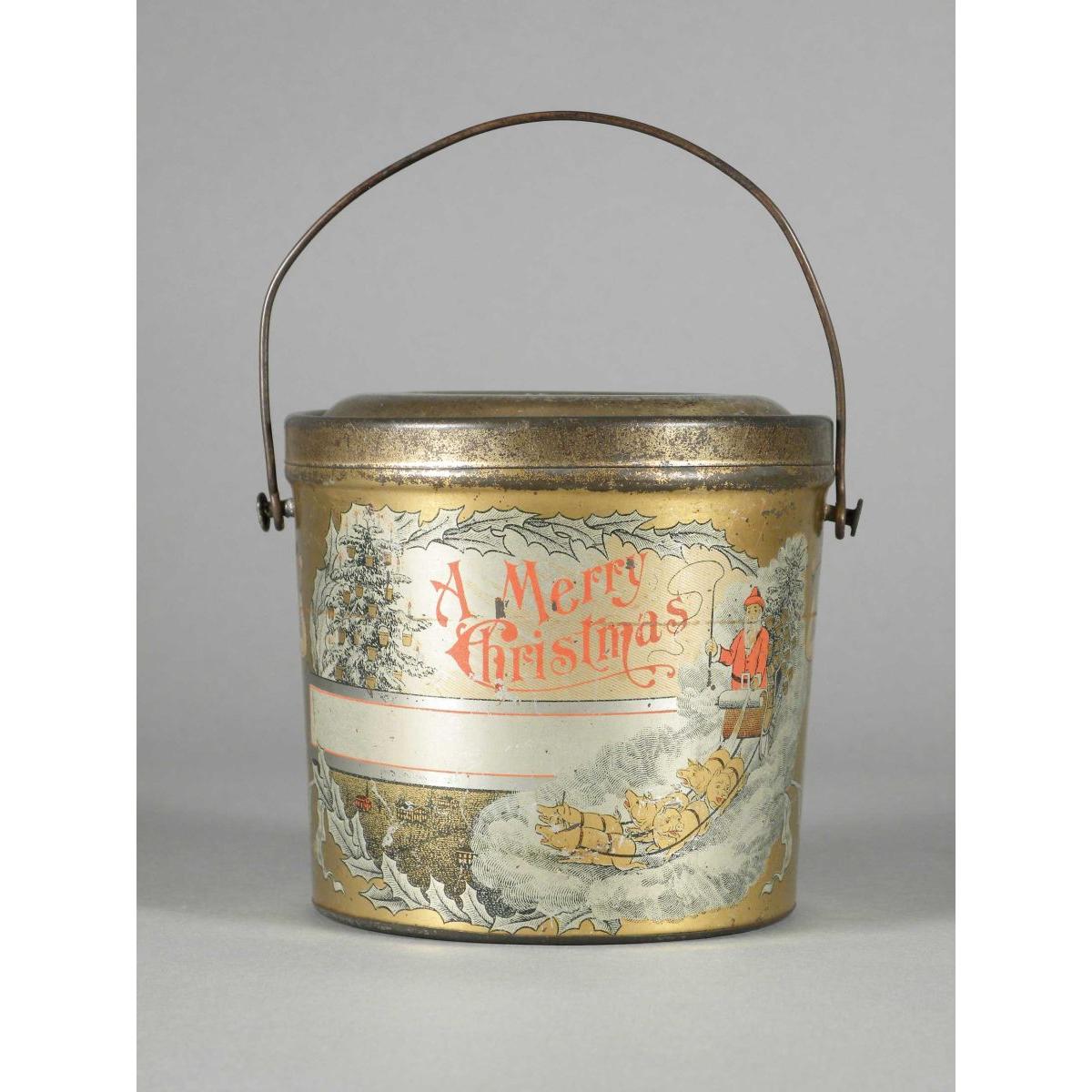 Generic Peanut Butter Tin, A Merry Christmas. Some light surface scratches otherwise good condition. 3 1/2 inch diameter X 3 1/4 inches tall.