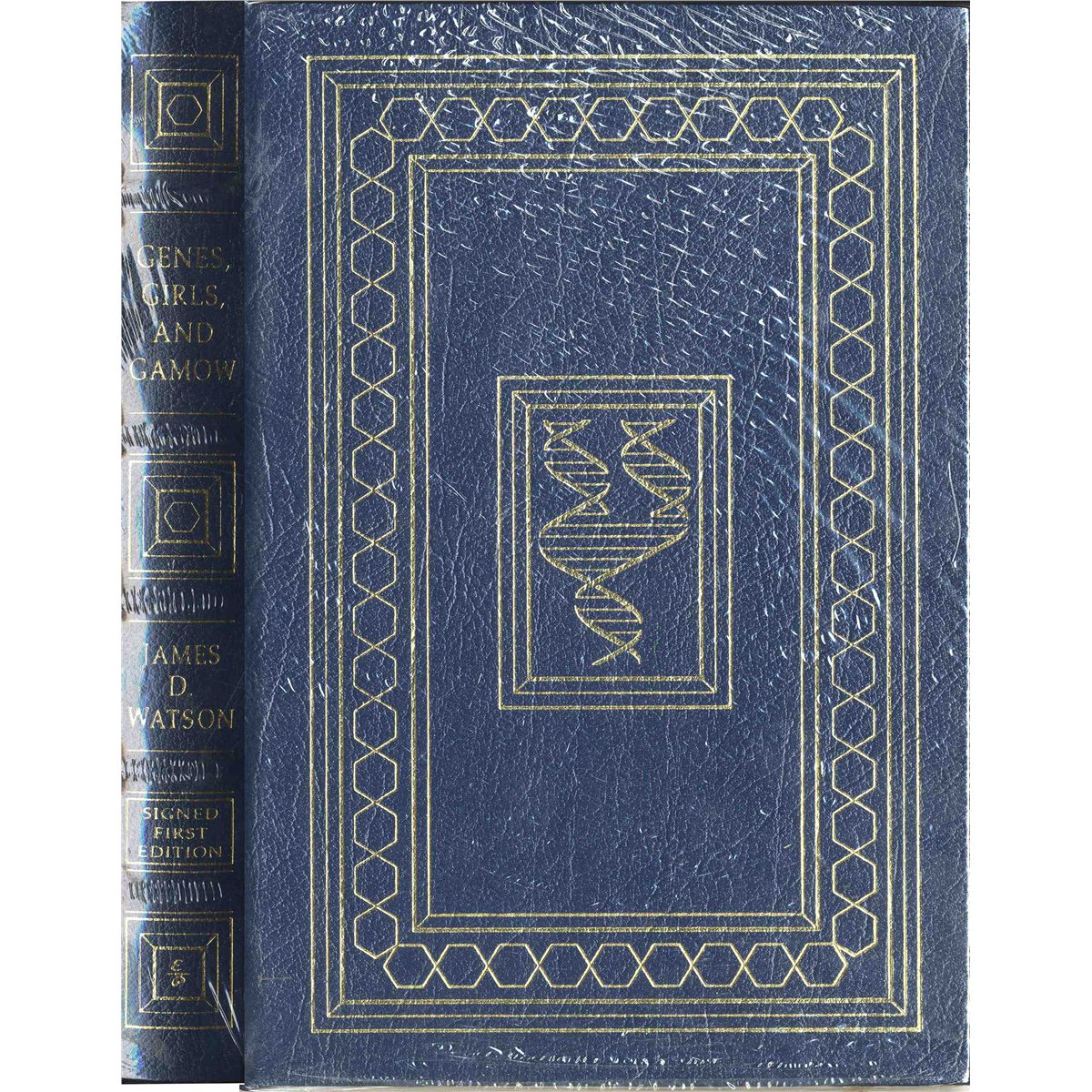 James D. Watson's signed book, ''Genes, Girls, and Gamow.'' Norwalk, Connecticut: Easton Press: 2002. 1,175 copies printed. Blue leather book with decorative 22kt. gilt on cover and page edges also has a gold double helix on the center cover. Autographed by James D. Watson, Nobel Prize winning scientist and co-discoverer of the DNA structure and genetic code. 6.5'' x 9.5'' volume remains sealed in original shrink wrap. Satin ribbon page marker and smyth-sewn pages. Fine condition.