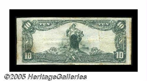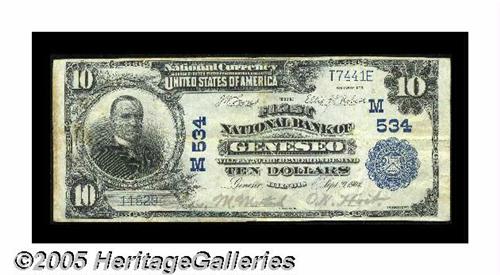 <B>Geneseo, IL</B></I> - $10 1902 Plain Back Fr. 624 <B>The First NB</B></I> Ch. # (M)534<BR>Stamped signatures of Chas. M. Morton and O.W. Holt grace this $10 from Henry County. There is some soiling mostly around the edges, while the remaining surfaces are clean with a minimum of folds for the grade. <B>Very Fine.</B></I>