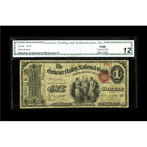 <B>Geneseo, NY</B></I> - $1 Original Fr. 380 <B>The Genesee Valley NB</B></I> Ch. # 886<BR>An evenly circulated and nicely margined ace with the blue Treasury number indicating it was part of the first group of Nationals printed. CGA graded <B>Fine 12.</B></I><BR><BR><b>Shipping:</b> Coin/Currency (<a target="_blank" href="http://www.heritageauctions.com/common/shipping.php">view shipping information</a>)