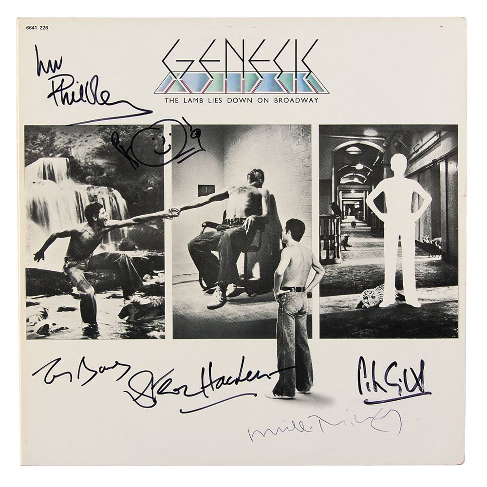 The Lamb Lies Down on Broadway album by Genesis, signed on the front cover in black ballpoint by Mike Rutherford, and in black felt tip by Peter Gabriel, Steve Hackett, Tony Banks, and Phil Collins, who adds a small sketch of himself with drum sticks. In fine condition. The records are included.