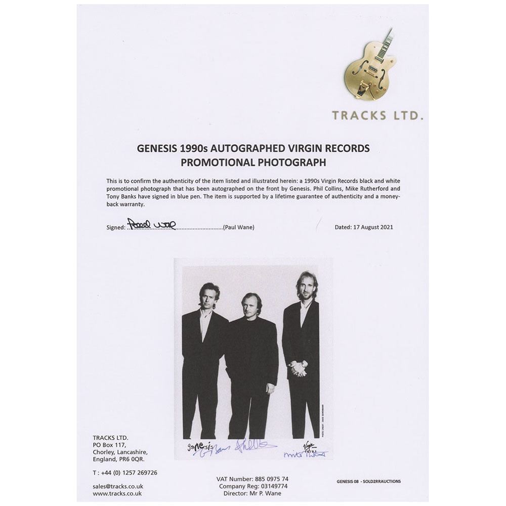 Circa 1991 satin-finish 8 x 10 Virgin Records publicity photo of Genesis wearing dark suits, signed in purple ink by Tony Banks, Phil Collins, and Mike Rutherford. In very fine condition. Accompanied by a certificate of authenticity from Tracks.