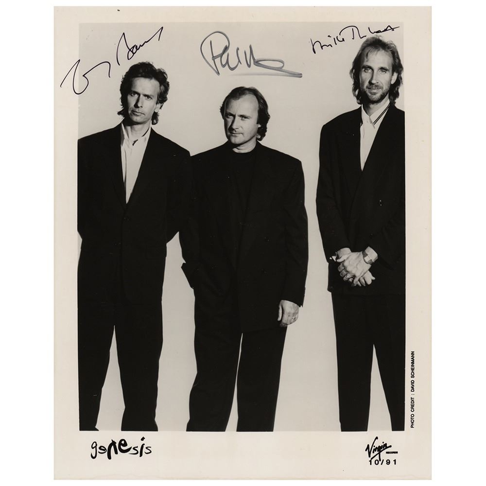 Satin-finish 8 x 10 Virgin Records promo photo of Genesis, signed in black felt tip by Phil Collins, Mike Rutherford, and Tony Banks. In fine condition, with a few small creases.