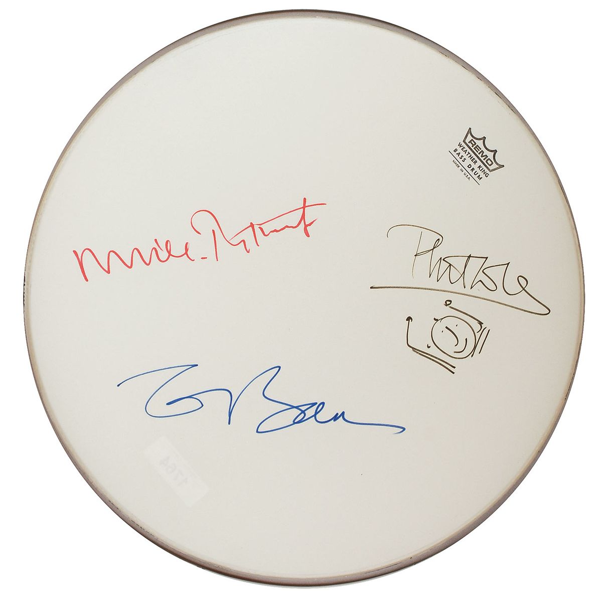 Unused 20? coated Remo drumhead, signed in black felt tip by Phil Collins, adding a small caricature, in red felt tip by Mike Rutherford, and in blue felt tip by Tony Banks. In fine condition. Consignor notes that this item was signed as part of a promotion for the ‘I Can't Dance’ stadium tour.