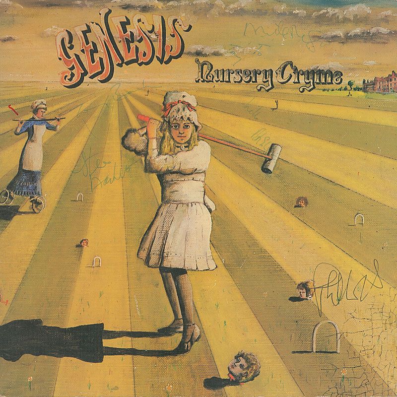 Nursery Crime album (pink label double gatefold) signed on the front cover in green ballpoint by Peter Gabriel (ins), Steve Hackett, Tony Banks, and Mike Rutherford, and in black ballpoint by Phil Collins. Also signed again on the back cover by Gabriel. In fine condition, with some scattered light edge wear. The record is included. Accompanied by a letter from a previous owner stating the album originates from a Liverpool collector and friend of the band.