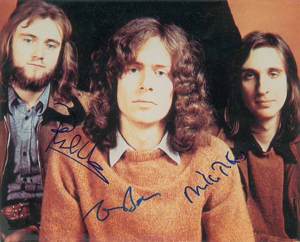 Early color glossy 10 x 8 photo of the band as a trio, signed in person in blue felt tip by Phil Collins, Mike Rutherford, and Tony Banks. In fine condition. Originally obtained by in-person specialist Mike Wehrmann.