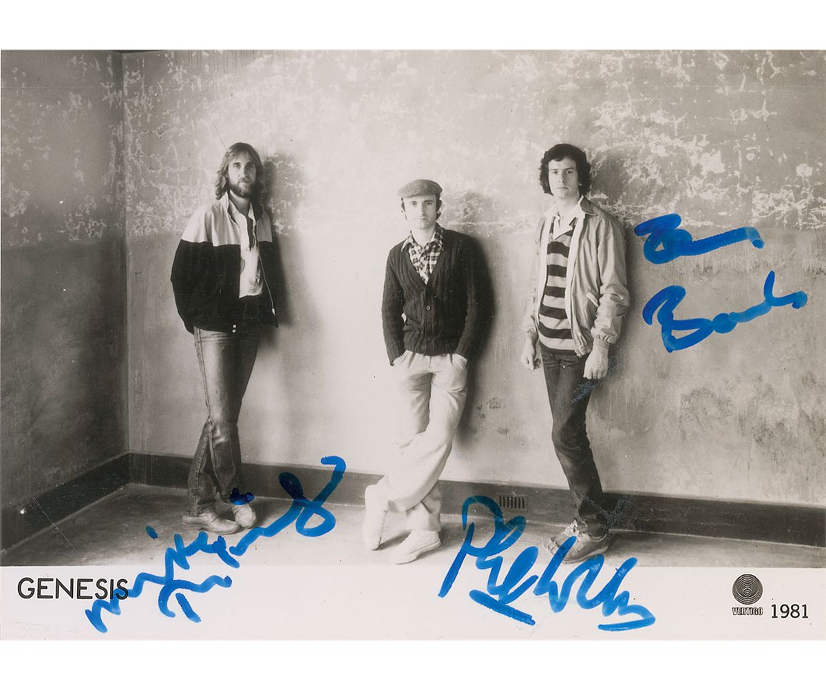 Glossy 7 x 5 publicity photo of the band from 1981, signed in blue felt tip by Phil Collins, Mike Rutherford, and Tony Banks. In fine condition, with some light mounting and adhesive remnants on reverse.