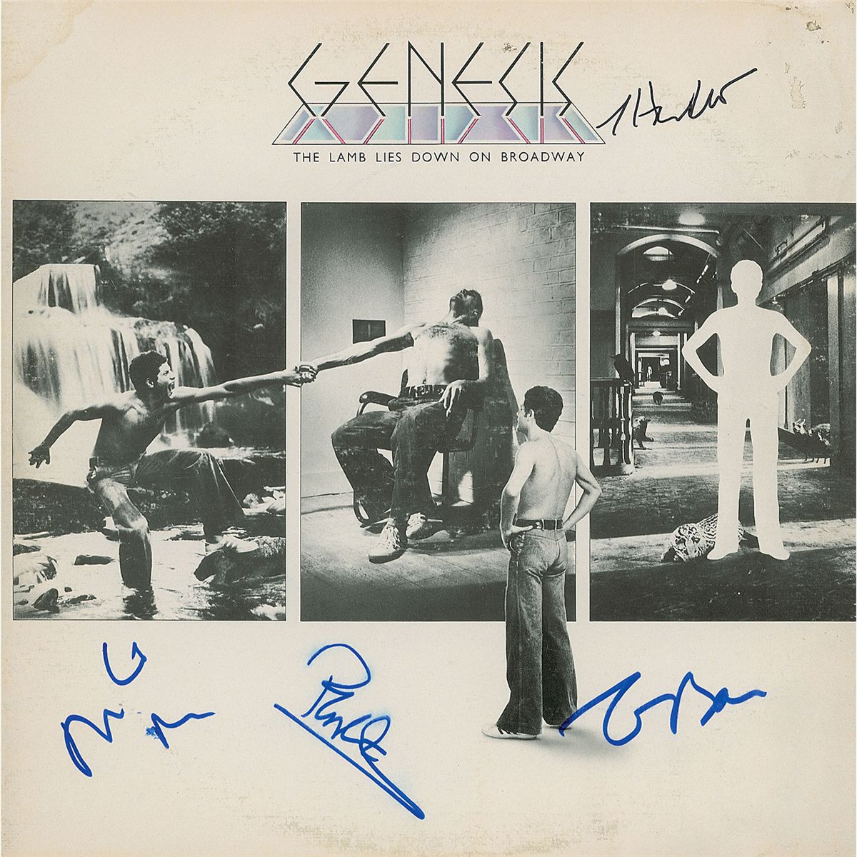 The Lamb Lies Down on Broadway album signed on the front cover in blue and black felt tip by Phil Collins, Tony Banks, Mike Rutherford, and Steve Hackett. A light ‘ring of wear,’ dampstaining to upper corners, label remnants to upper right, and a bit of brushing to two signatures, otherwise fine condition. The records are included.