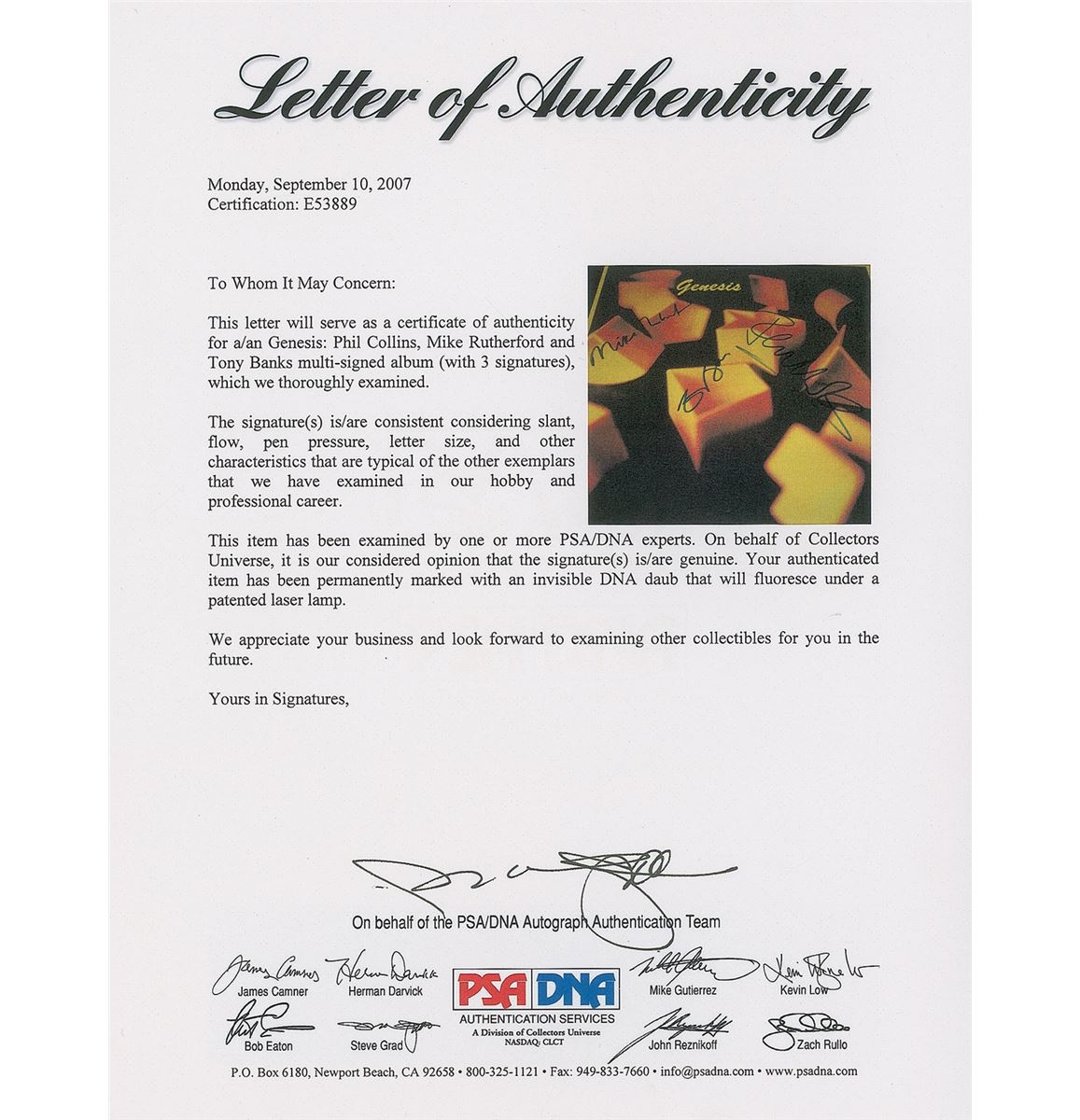 Self-titled album signed in blue felt tip by Phil Collins, Mike Rutherford, and Tony Banks. In fine condition, with a slight ‘ring of wear.’ The record is not included. Accompanied by a full letter of authenticity from PSA/DNA.