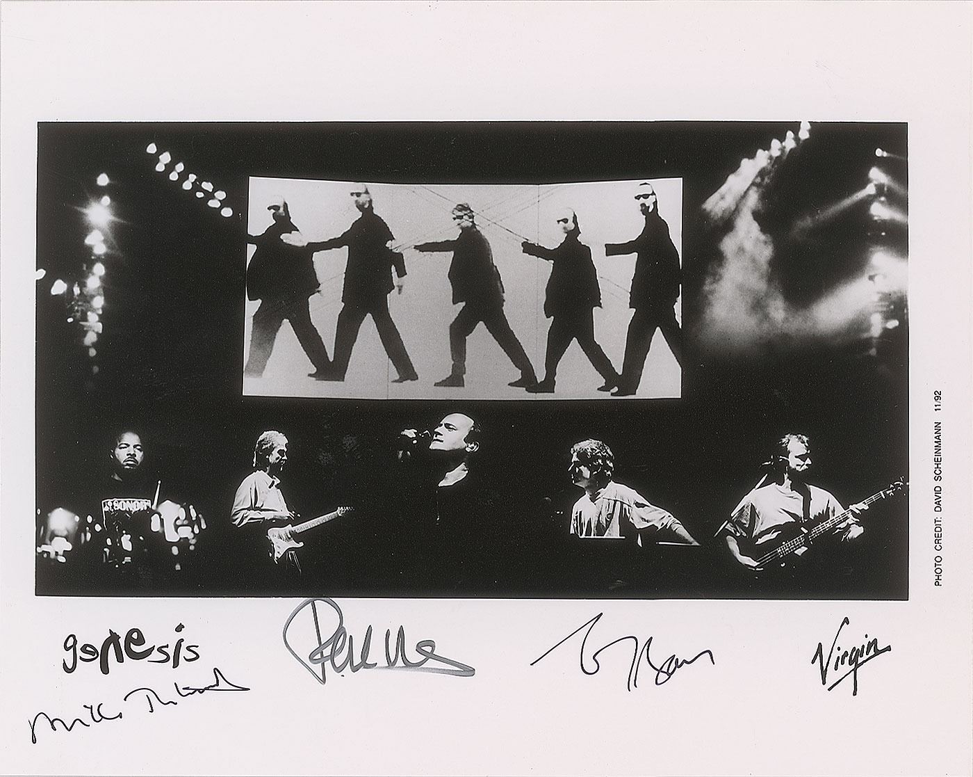 Satin-finish 10 x 8 Virgin Records publicity photo of Genesis relating to their The Way We Walk project, signed in the lower border in black ink or felt tip by Tony Banks, Mike Rutherford, and Phil Collins. In fine condition.