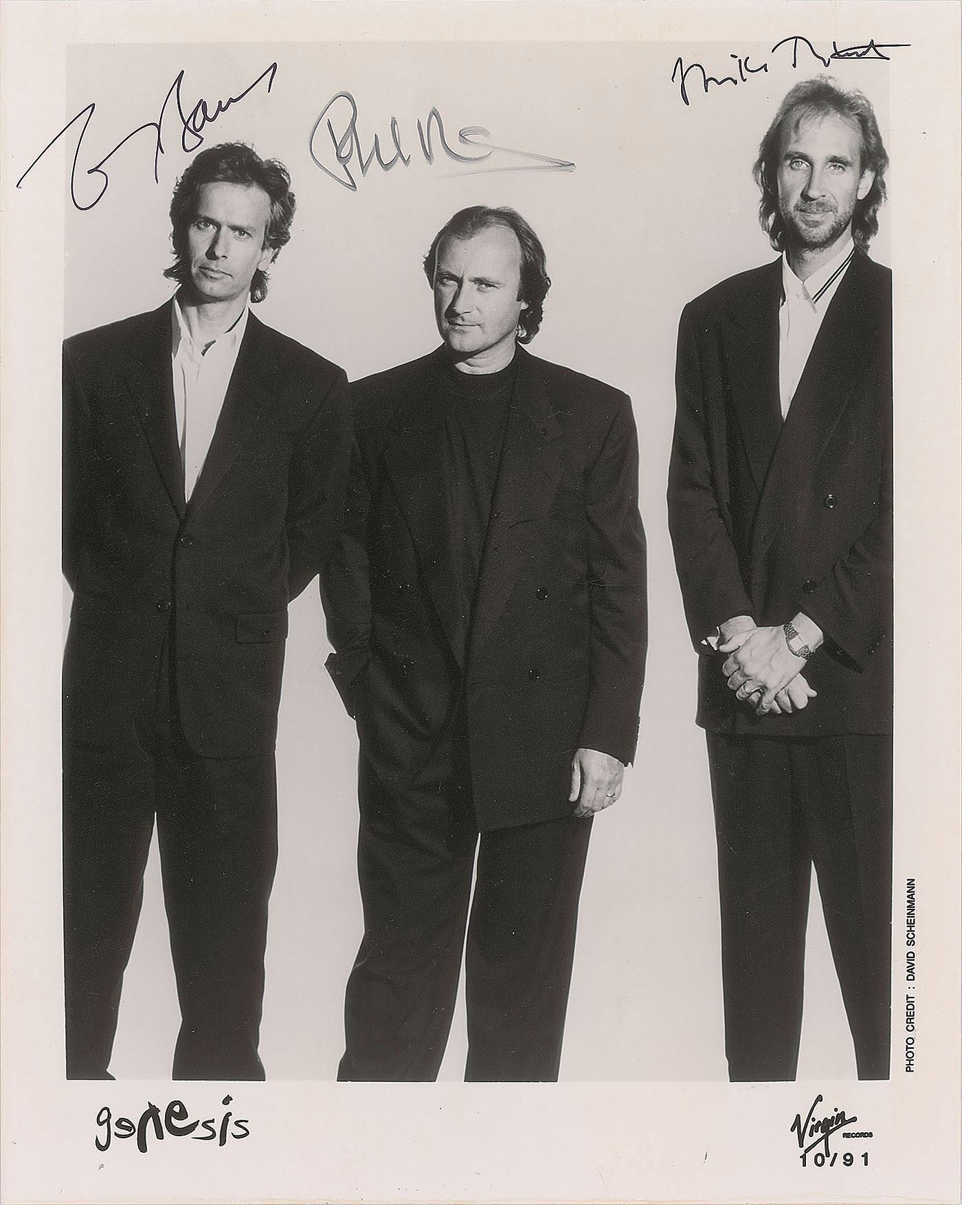 Circa 1991 satin-finish 8 x 10 Virgin Records publicity photo of Genesis wearing dark suits, signed in black felt tip by Tony Banks, Phil Collins, and Mike Rutherford. In fine condition.