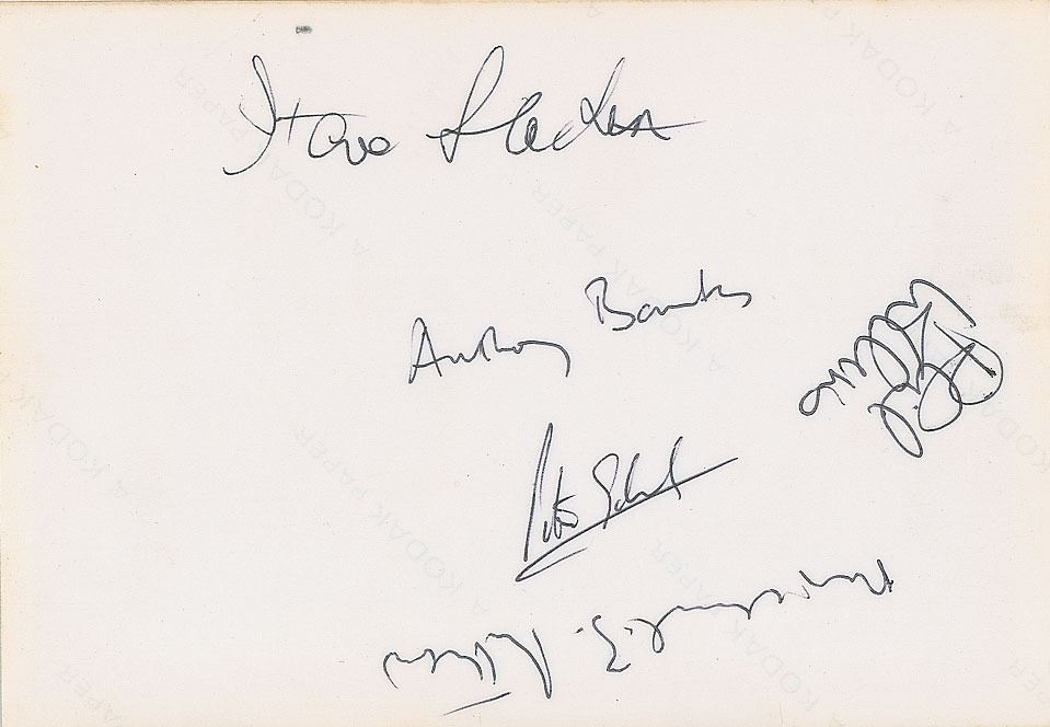 Color glossy 5 x 3.5 candid photo of Genesis playing at Worthing Assembly Hall on September 14, 1972, signed on the reverse in black ballpoint by Peter Gabriel, Phil Collins, Steve Hackett, Tony Banks, and Michael Rutherford. In fine to very fine condition. Accompanied by a letter of provenance from the original recipient: "The photograph of Genesis, showing Peter Gabriel, Steve Hackett (seated), and Mike Rutherford was taken by me at Worthing Assembly Hall on Friday 14th September 1972. Only one print was ever made. I took the picture to the Rainbow Theatre Finsbury Park London on Friday October 19th 1973. The photo was signed by the whole band during the afternoon rehearsals."