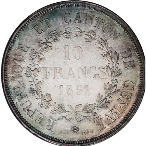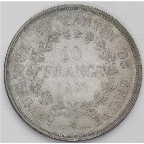 Geneva. 10 Francs 1851, KM138, D-374, Choice lightly to Geneva. 10 Francs 1851,