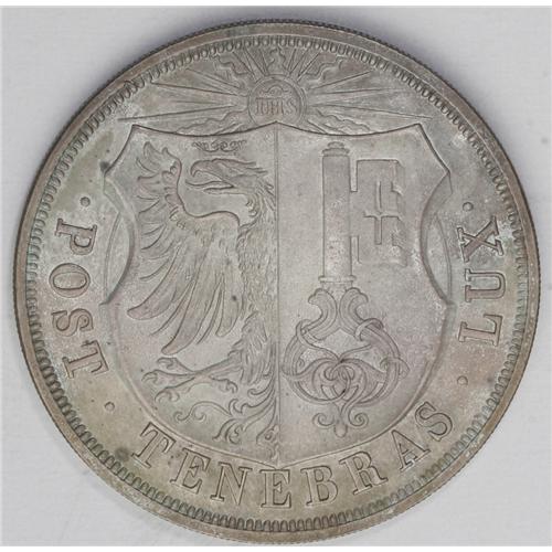 <B>Geneva. 10 Francs 1851, </B></I>KM138, D-374, Choice lightly toned AU-Unc. A rare two year type with a mintage this year of only 678.