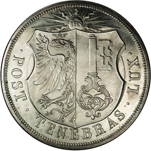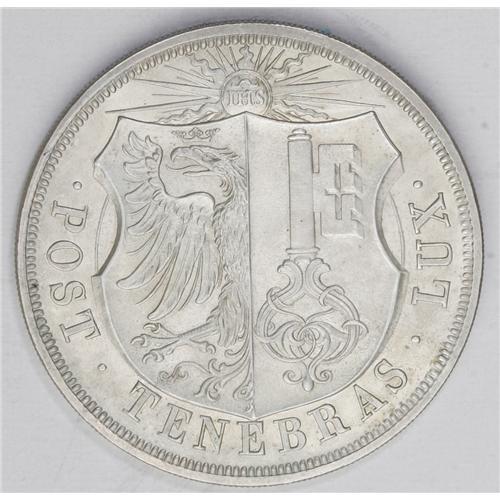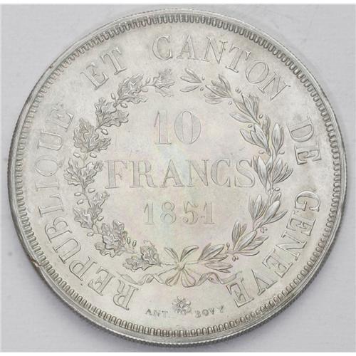 <B>Geneva. 10 Francs 1851, </B></I>KM138, D-374, Uncirculated with light silvery toning over somewhat proof like surfaces. A rare two year type with a mintage of only 678.